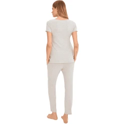 Nachtwäsche für schwangere Frauen in Grau. Schmiegt sich sanft an die Figur an und sorgt für Komfort beim Schlafen. Die Pyjamas sind auch zum Stillen geeignet. Die Pyjamabluse ist mit einer kuvertförmigen Blende versehen, die das Stillen erleichtert, ohne unnötige Verschlüsse, Reißverschlüsse oder Knöpfe. Diese bequeme und gleichzeitig diskrete Lösung wird von jeder stillenden Mutter geliebt werden.Das Pyjama-Oberteil ist unter der Brust abgeschnitten und unten verbreitert, wodurch es sich dem wachsenden Schwangerschaftsbauch anpasst. Die Hose hat einen hohen elastischen Bund, der der werdenden Mutter einen hohen Tragekomfort bietet. Der Schlafanzug eignet sich gut zum Füttern des Kindes im Krankenhaus und zu Hause.