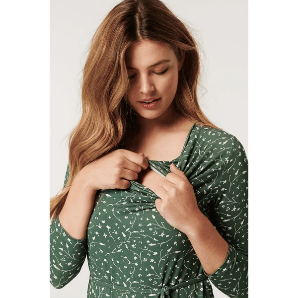 Ihr wachsender Bauch kommt in diesem Bodycon-Kleid mit Blumenprint von Noppies Maternity wunderbar zur Geltung. Das Kleid Kimberley hat einen Wasserfallausschnitt, Dreiviertel-Ärmel und fällt bis knapp über das Knie. Mit dem passenden Schleifenband setzen Sie einen zusätzlichen Akzent auf Ihre schwangere Figur. Auch nach der Geburt werden Sie dieses Kleid noch gerne tragen. Nicht nur, weil es so bequem ist, sondern auch, weil es sich durch die doppelte Lage zum diskreten Stillen eignet.Wir möchten Ihnen das Stillen so einfach und angenehm wie möglich machen. Sie müssen nur die horizontale Schicht nach oben ziehen. Das Unterteil lässt sich leicht nach unten schieben.Um den Bauch herum befinden sich Falten für zusätzlichen Komfort. Diese spezielle Nähtechnik sorgt dafür, dass Ihr Bauch extra Platz zum Wachsen hat. Wunderbar bequem!