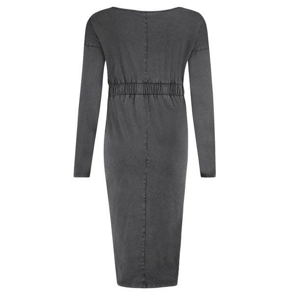 Weise. Das Midi-Modell mit Washed-Look hat einen femininen V-Ausschnitt, grobe